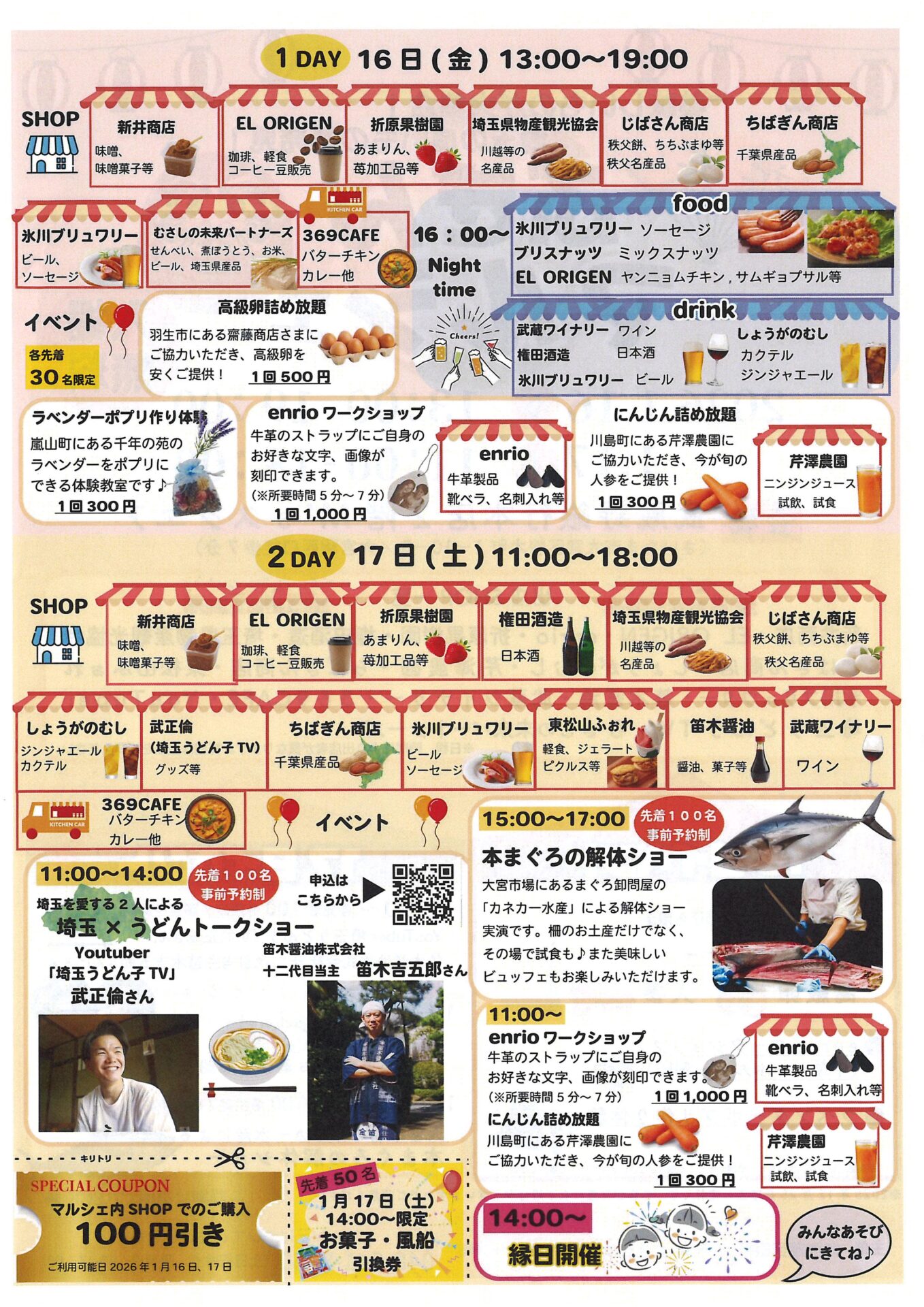 2025.12.25 お知らせ 1月:ぶぎんマルシェに出店します! 1月16日、17日『ぶぎんマルシェ』が開催されます! 笛木醤油は17日マルシェ出店、同じく17日11:00~14:00のトークショーに12代目吉五郎が登壇します!! トークショーはYouTuber「さいたまうどん子TV」の倫さんと吉五郎による「埼玉×うどん」テーマ! どんなおいしいうどん話が飛び出すのか楽しみですね!! こちら事前予約制となります。上記QRからお申込みください。(先着順) 入場無料でほかにも楽しそうなものいっぱいのぶぎんマルシェ、ぜひお出かけください! イベント蔵元からの便り お知らせ一覧へ戻る