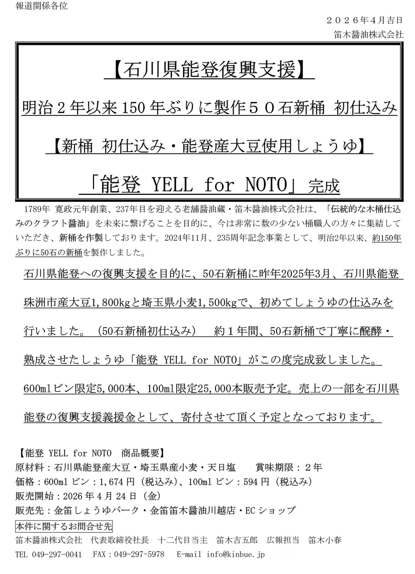 2026.04.21 プレスリリース 【プレスリリース】【石川県能登復興支援】 明治2年以来150年ぶりに製作50石新桶 初仕込み・能登産大豆使用しょうゆ 「能登 YELL for NOTO」完成 新商品蔵元からの便り お知らせ一覧へ戻る